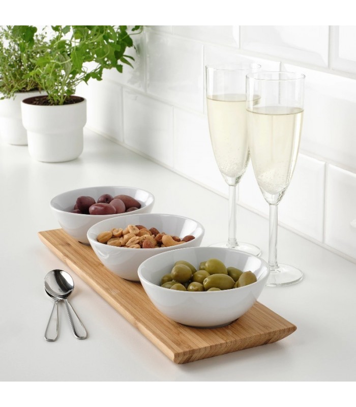 ست سینی TYNGDLÖS با ۳ عدد کاسه سفید از جنس سرامیک و پایه‌ی بامبویی، ترکیبی از سادگی، کاربرد و زیبایی در دکور میز پذیرایی یا آشپزخانه‌ی شماست. مناسب برای سرو انواع تنقلات، مزه، سس، خشکبار یا میوه‌های خردشده. طراحی مینیمال و طبیعی این محصول آن را به انتخابی ایده‌آل برای مهمانی‌ها و حتی استفاده‌ی روزمره تبدیل کرده است.