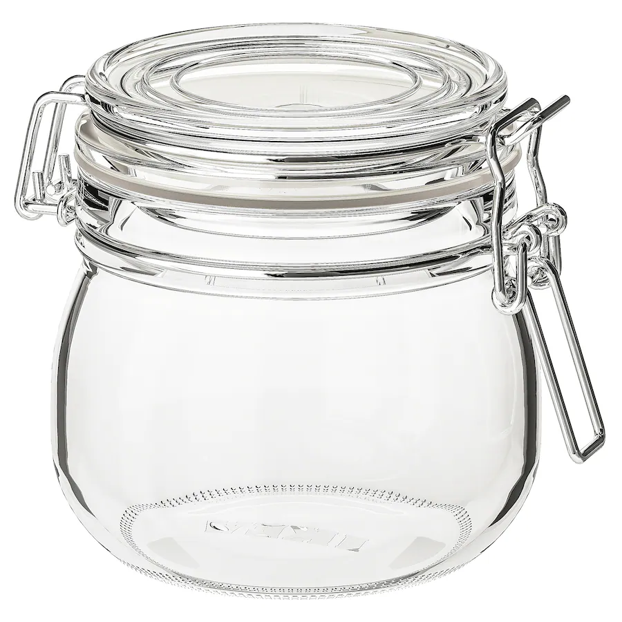 بانکه نیم لیتری ایکیا KORKEN دارای درب قفلی ، که آن را برای حفظ عطر و طعم مربا و ترشی های خانگی مناسب می کند.