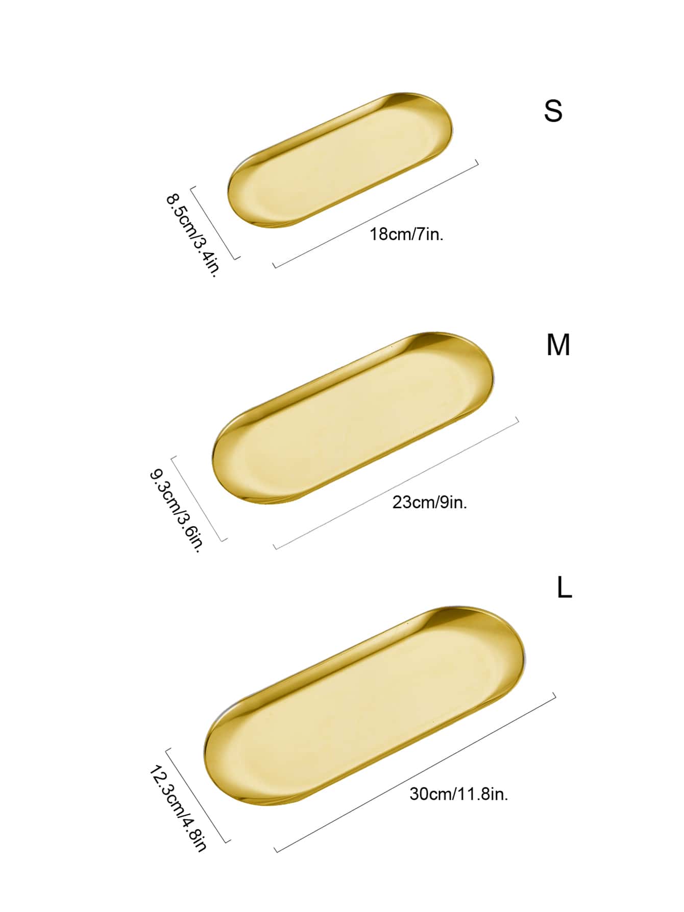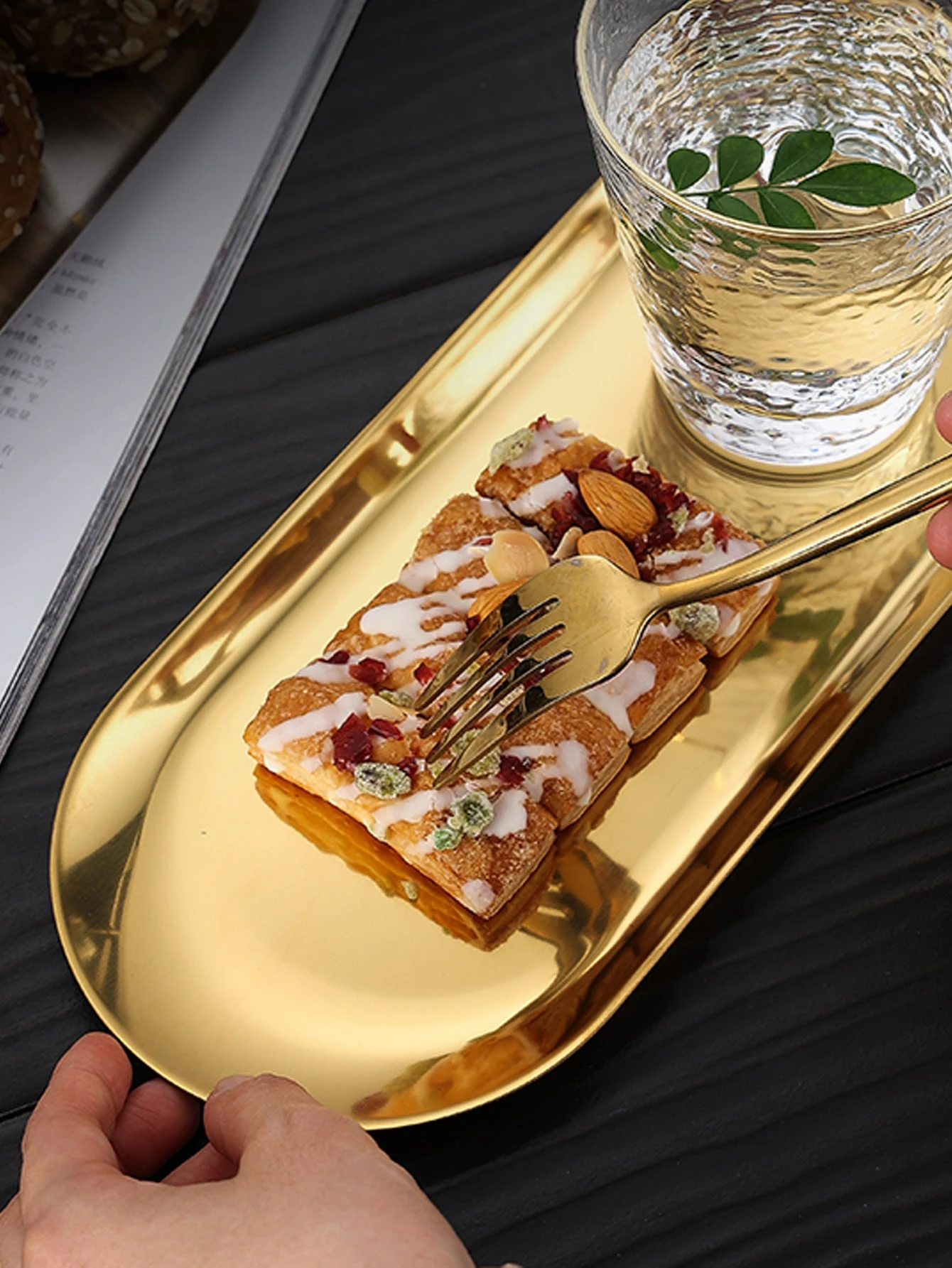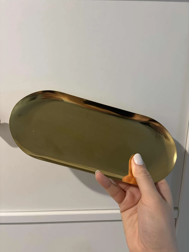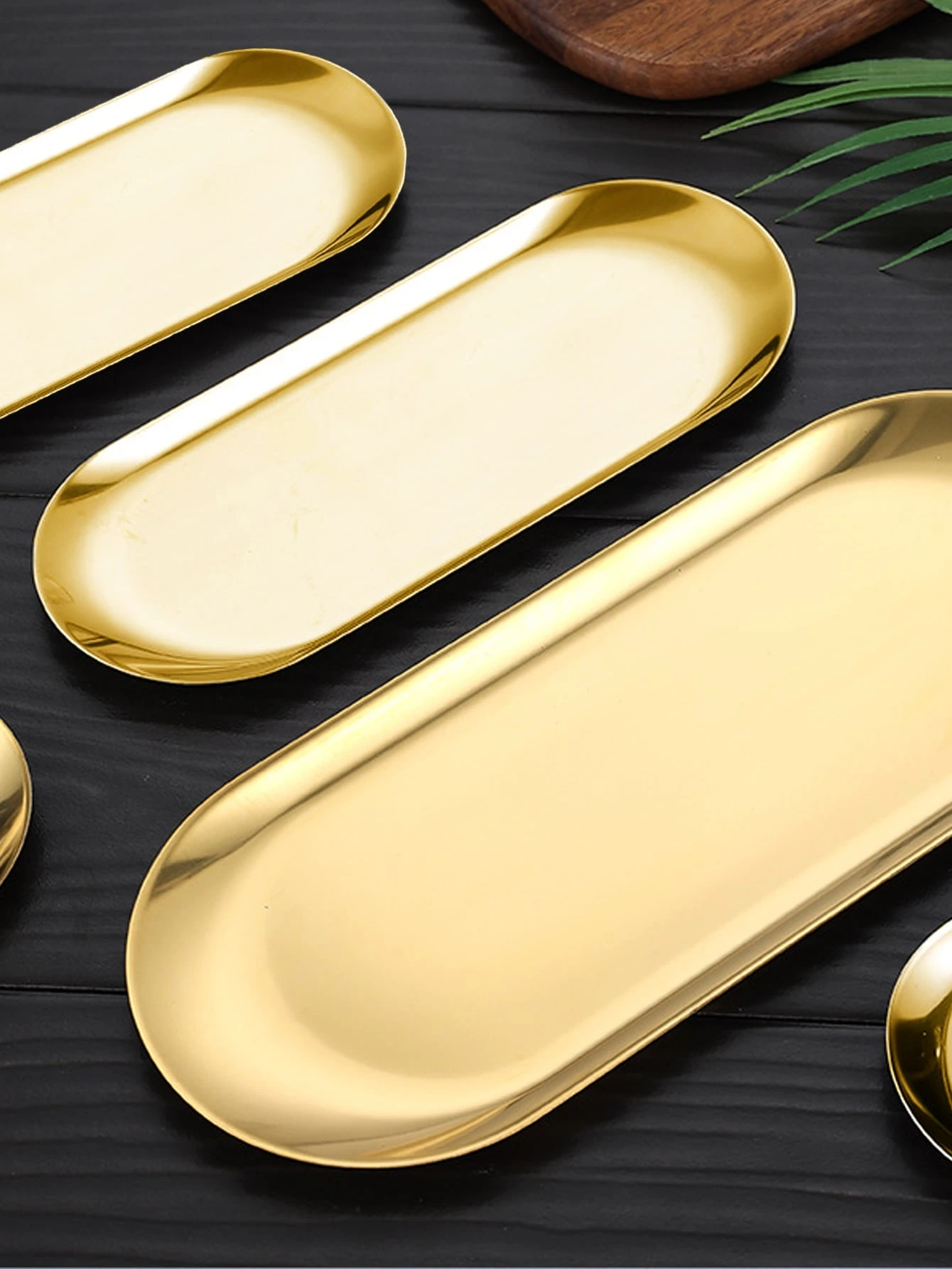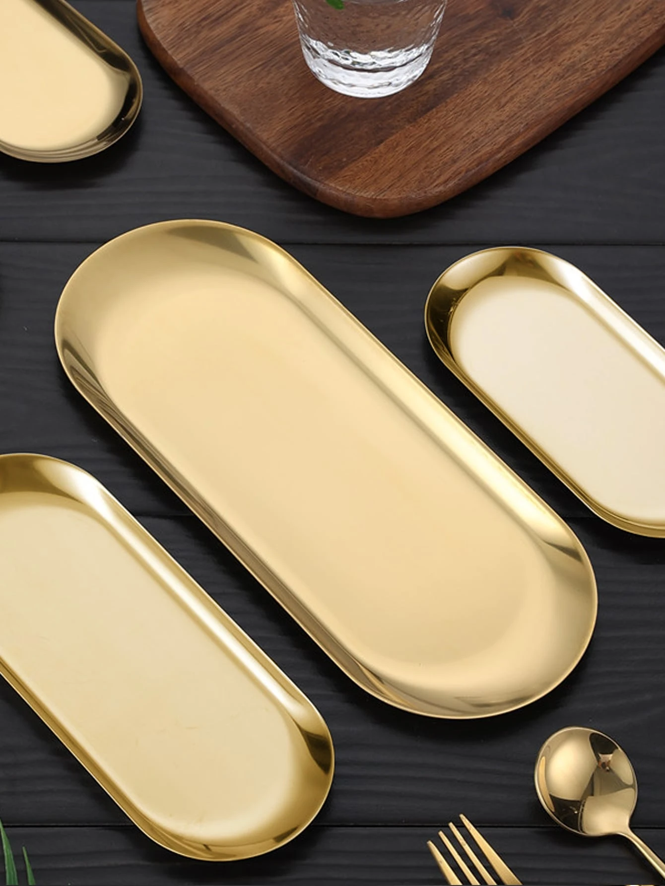 بشقاب استیل طلایی بیضی با طراحی مینیمالیست، گزینهای شیک و کاربردی برای سرو غذا در آشپزخانه، میز ناهارخوری و مهمانیها است.