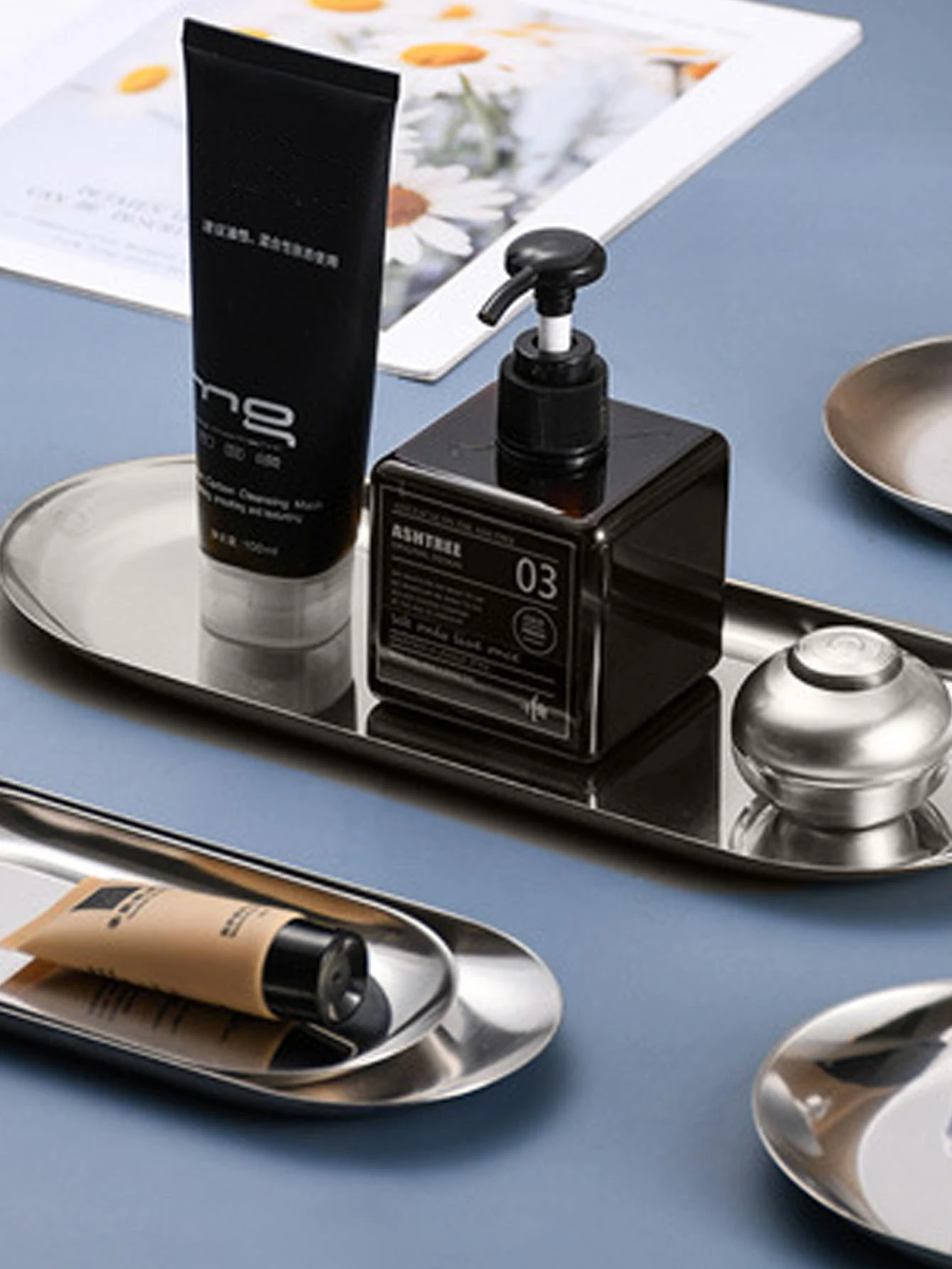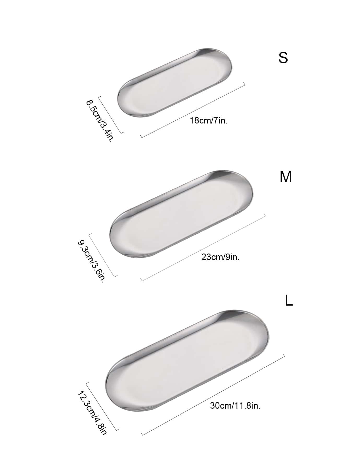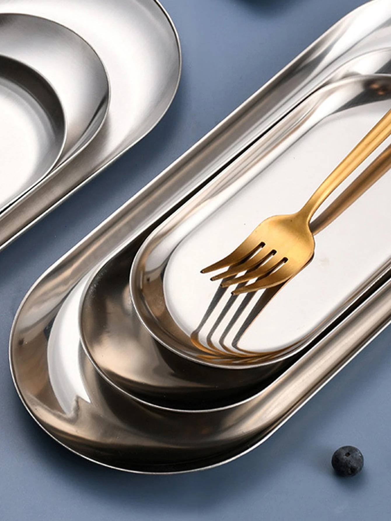 بشقاب استیل بیضی نقرهای با طراحی مینیمالیست، گزینهای شیک و کاربردی برای سرو غذا در آشپزخانه، میز ناهارخوری و مهمانیها است.