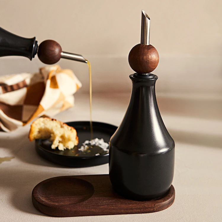 این بطری سرامیکی مشکی هم تزئینی و هم کاربردی است. آن را با درپوش قطرهای KRÖSAMOS یا درب بطری ترکیب کنید تا راحتتر ریخته شود و محتویات تازه بماند.