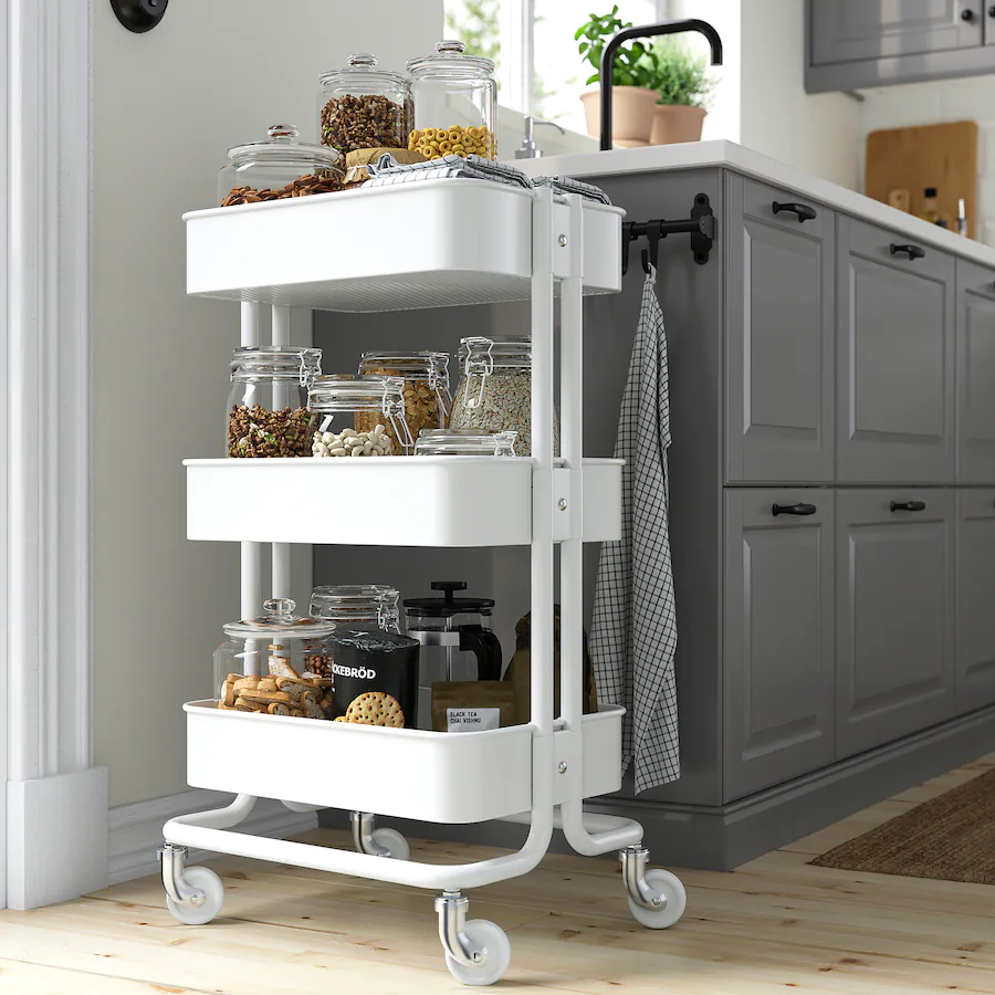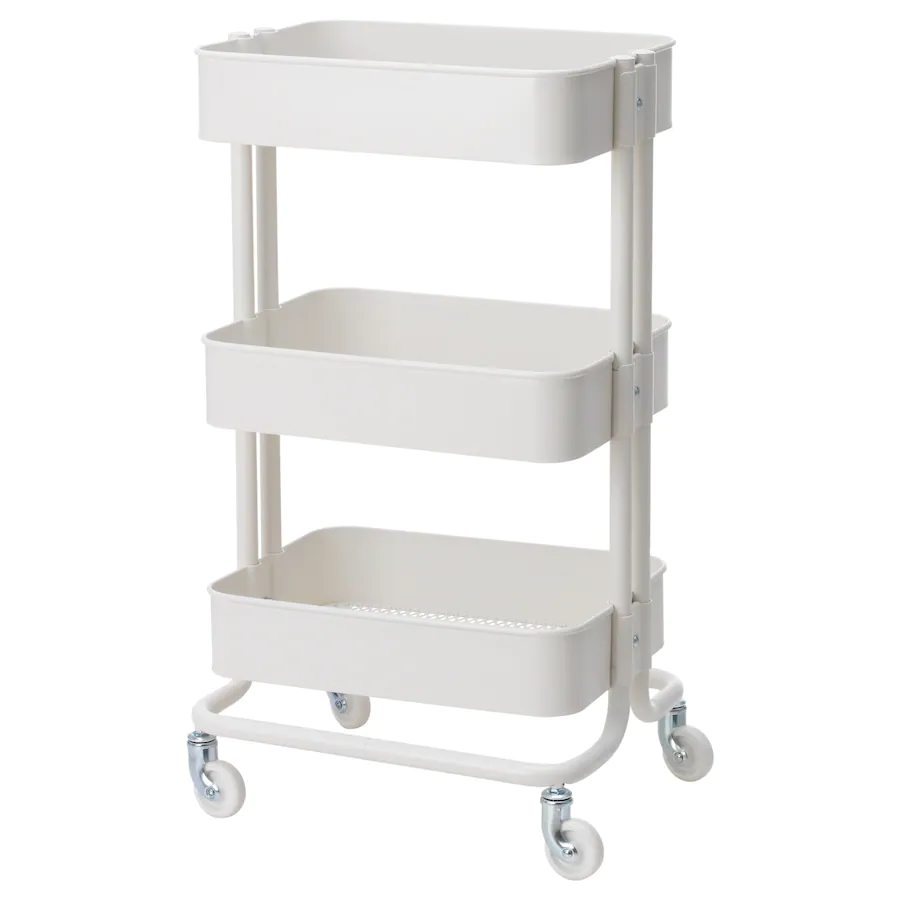 ترولی ایکیا رنگ سفید RَASKOG ایده آل برای استفاده در آشپزخانه، حمام یا جایی که به فضای ذخیره سازی اضافی نیاز دارید.
