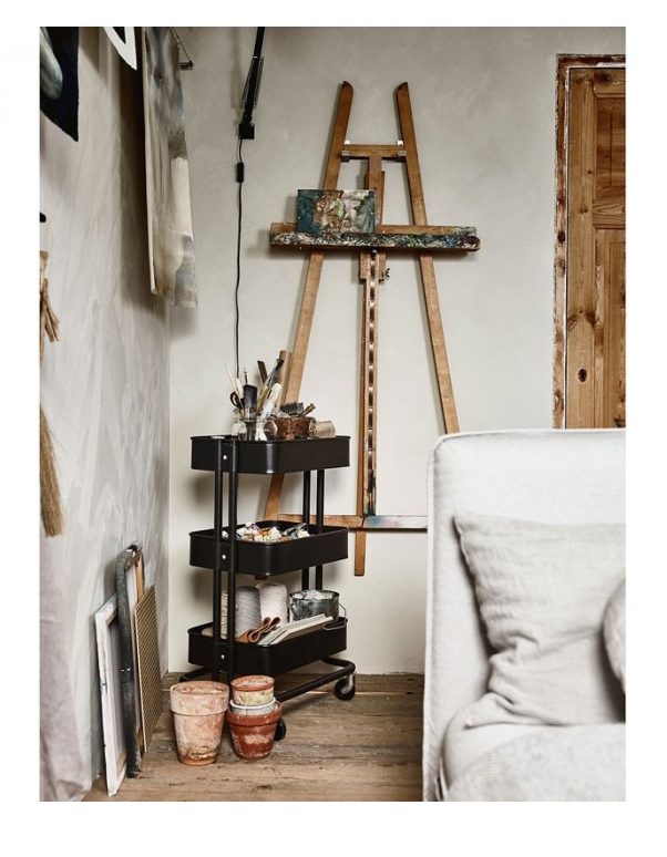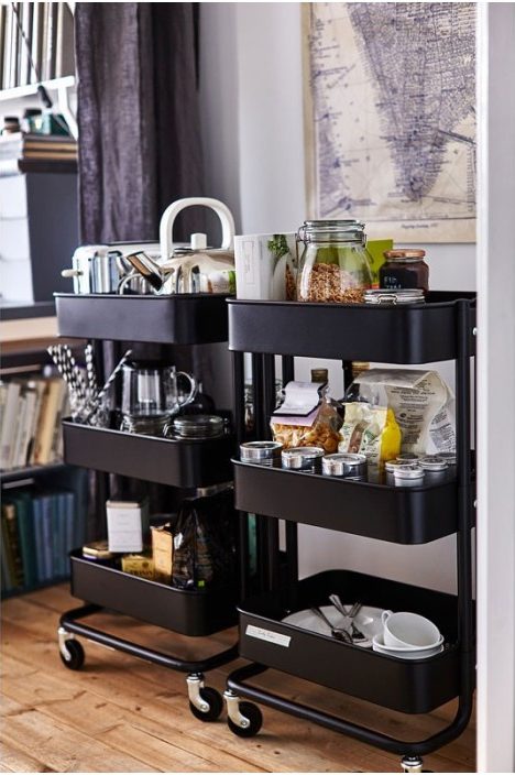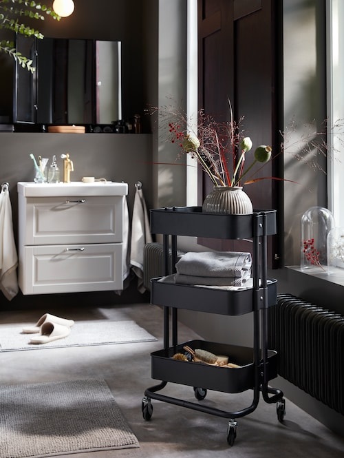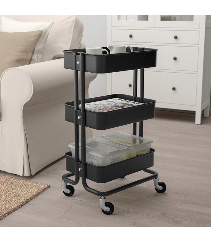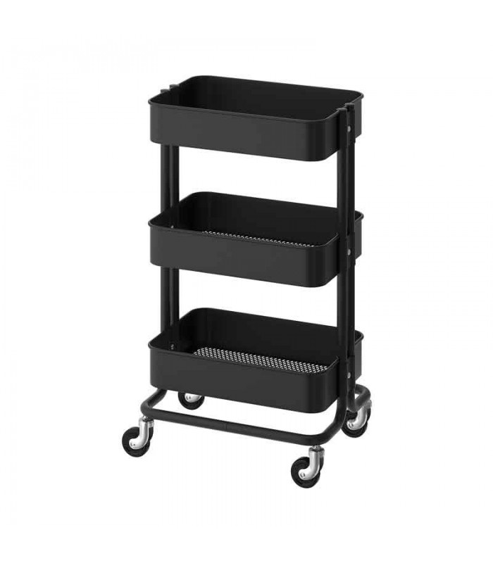 ترولی ایکیا رنگ مشکی RَASKOG ایده آل برای استفاده در آشپزخانه، حمام یا جایی که به فضای ذخیره سازی اضافی نیاز دارید.