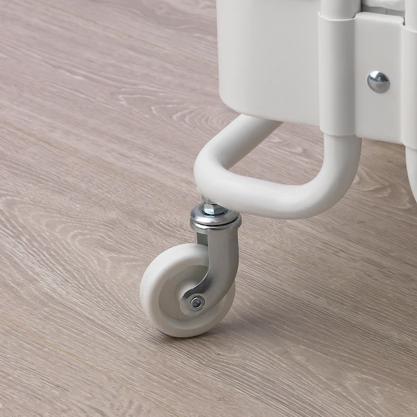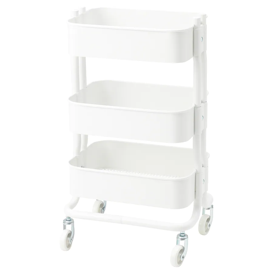 ترولی سفید ایکیا RÅSHULT در کوچکترین فضاها جای می گیرد و می توان آن را به هر جایی که نیاز دارید جابجا کنید.