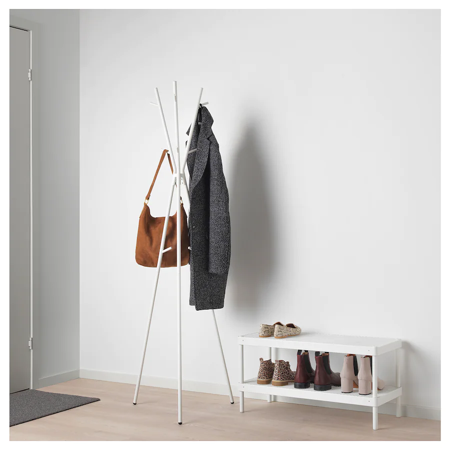 جا لباسی ایستاده سفید ایکیا با طراحی چشم نواز بسیار کاربردی برای آویز کردن کلاه کیف و لباس.