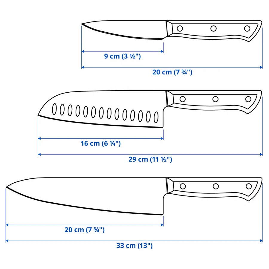ست چاقو دسته چوبی ایکیا VARDAGEN ترکیبی بینقص از عملکرد و زیبایی است. تیغههای تیز از استیل ضدزنگ باکیفیت ساخته شدهاند و دستههای چوبی از گردو، حس طبیعی و خوشدستی به ابزار میبخشند. مناسب برای کارهای مختلف آشپزی؛ از خرد کردن تا برش گوشت و سبزیجات.