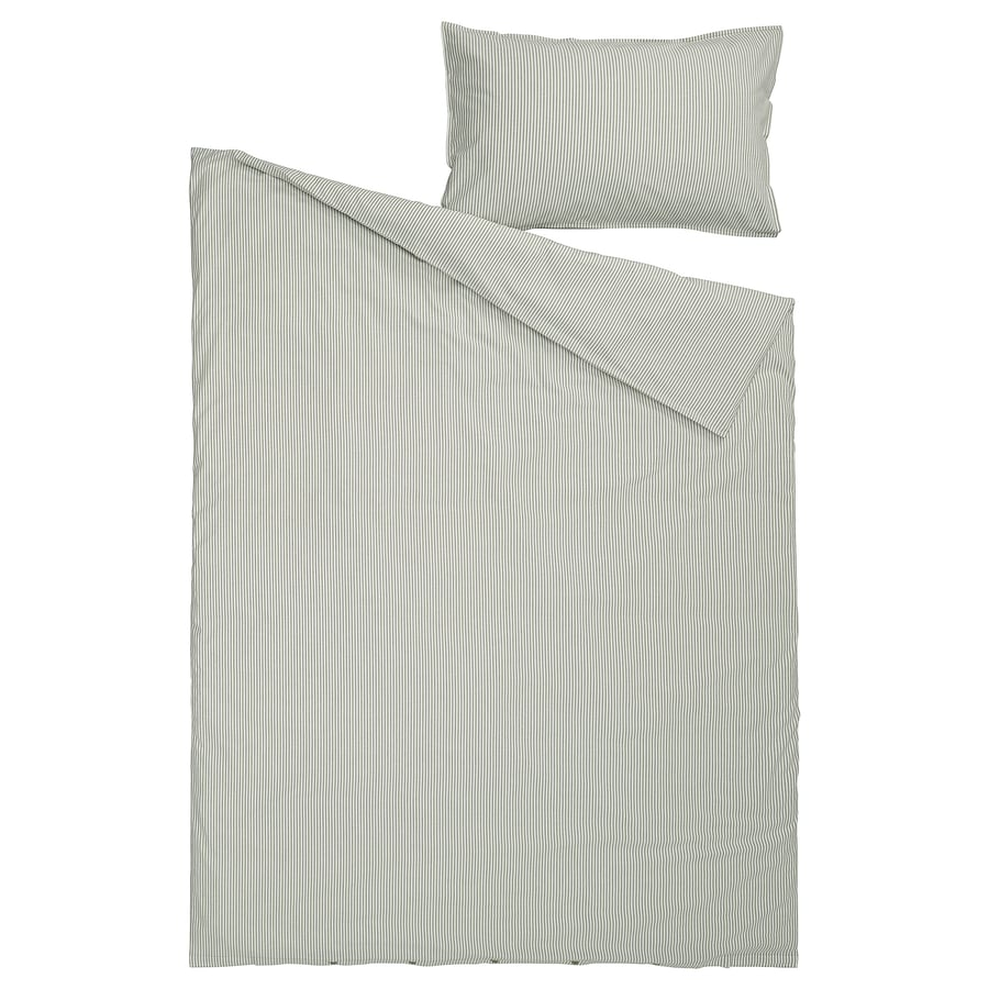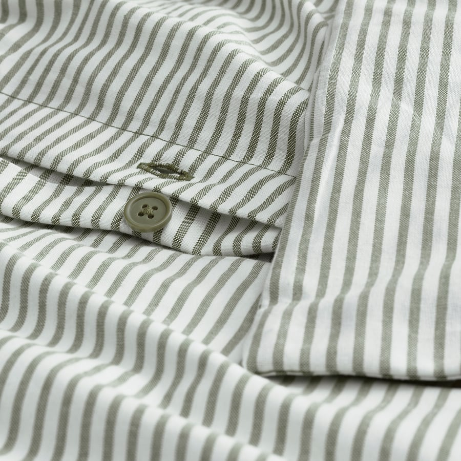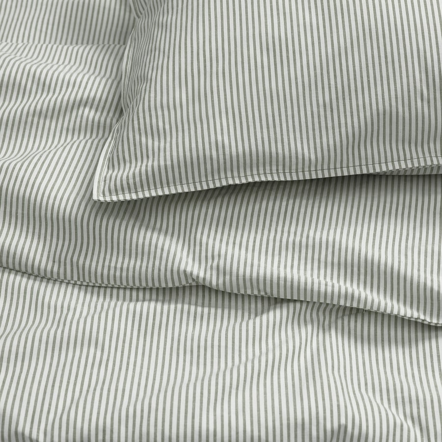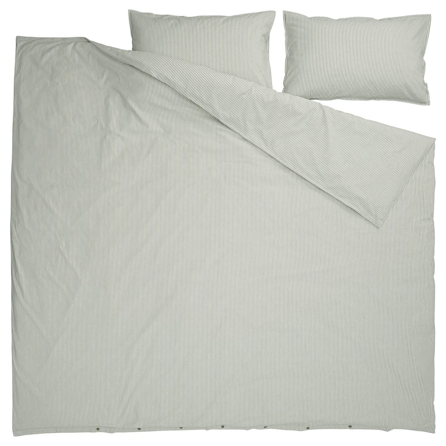 ست کاور لحاف و روبالشی ایکیا SOLFIBBLA انتخابی شیک و آرامشبخش برای دکور اتاق خواب است. ترکیب رنگ سفید و سبز با طرح راهراه حس تازگی، تمیزی و نظم را به فضا منتقل میکند و برای سبکهای مینیمال، اسکاندیناوی و مدرن کاملاً مناسب است.