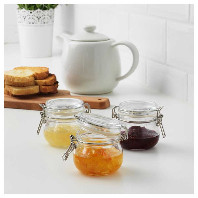 بانکه 3 عددی ایکیا KORKEN دارای کلیپس هایی از جنس استیل می باشد، واشر آن باعث جلوگیری از نفوذ هوا داخل آن میشود و برای نگهداری ترشی و مربا ، سرو یا ترد نگه داشتن کوکی ها ایده آل است.
