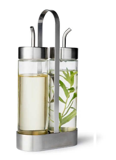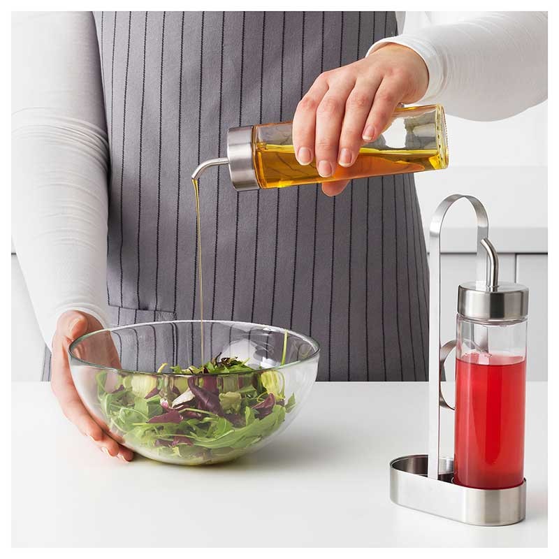 شیشه روغن و سرکه ایکیا ÖRTFYLLD شامل 2 بطری روغن و سرکه (قطر 5 سانتی متر ، ارتفاع 20 سانتی متر ، حجم 22 سانتی متر) و استند استیل.