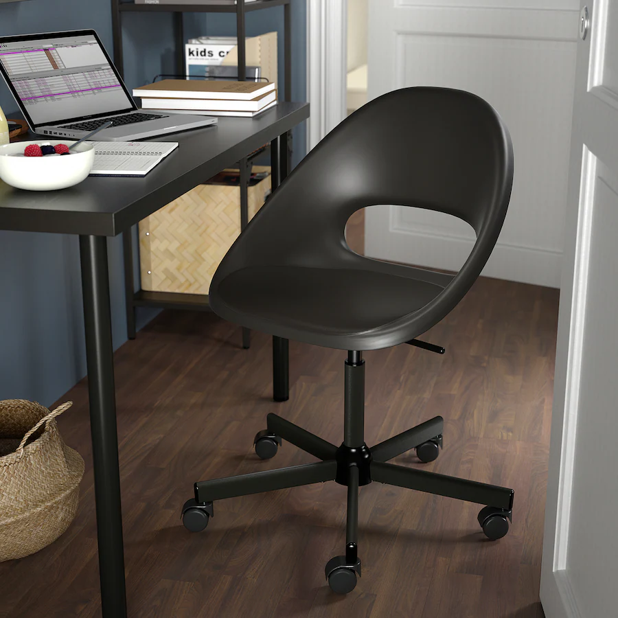 صندلی میز تحریر مشکی ایکیا ELDBERGET با طراحی ساده پشتیبانی از کمر، ارتفاع قابل تنظیم و چرخ‌های محکم این صندلی چرخدار را همه فن حریف می کند.