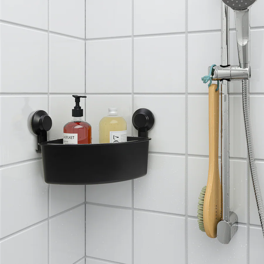 طبقه گوشه حمام ایکیا TISKEN یک نظمدهنده کاربردی و بدون نیاز به سوراخکاری برای حمام است. این طبقه با استفاده از سیستم مکنده (وکیوم) روی سطوح صاف مانند کاشی، شیشه و سرامیک نصب میشود و گزینهای ایدهآل برای نگهداری شامپو، نرمکننده و لوازم بهداشتی است.