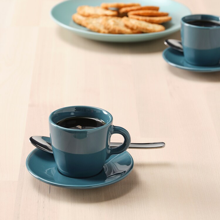 فنجان نعلبکی FÄRGKLAR با حجم 70cc و رنگ فیروزه ای دارای طراحی ساده، پایه ای عالی برای هماهنگی با سایر ظروف غذاخوری است.
