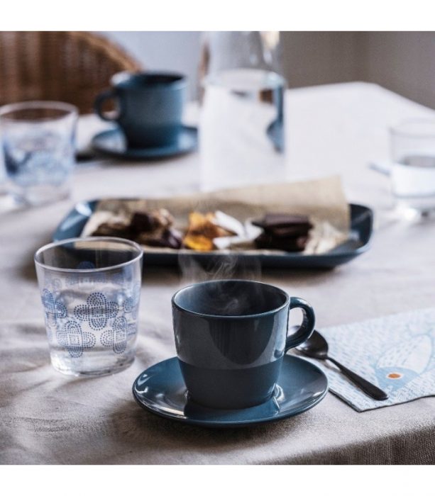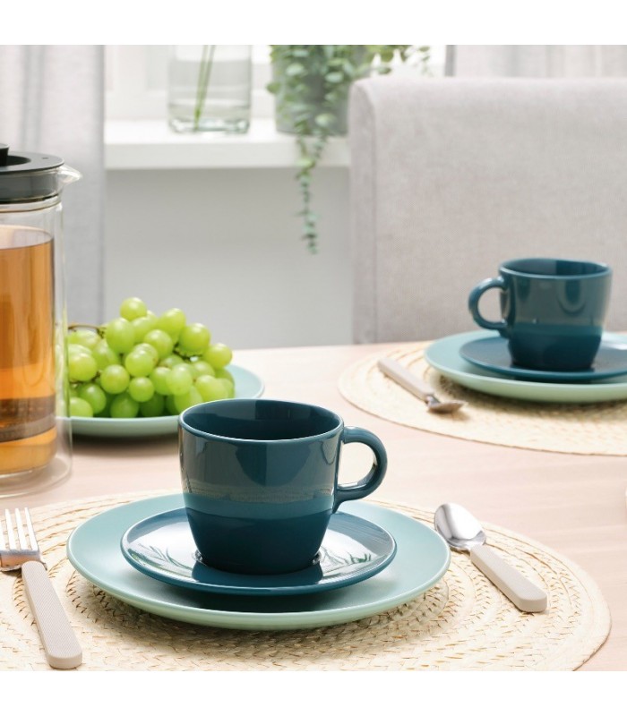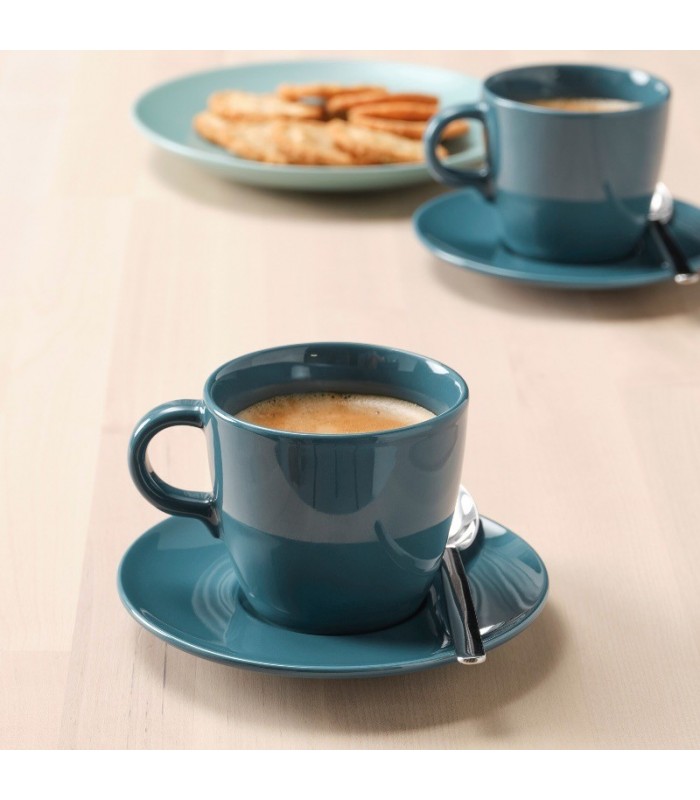 فنجان ونعلبکی قهوه خوری ایکیا با رنگ فیروزه ای تیره براق با طرحی ساده و کاربردی که هماهنگی آن با سایر رنگها و اشکال آسان است.