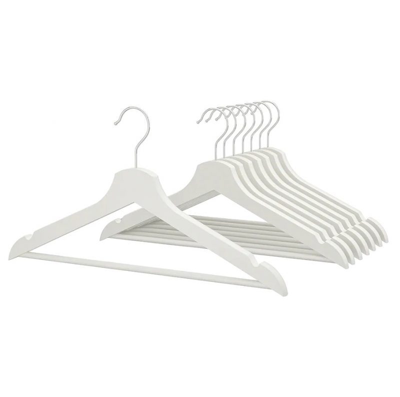 چوب لباسی سفید 8 عددی ایکیا BUMERANG از جنس چوب راش که حس واقعی از کیفیت را به کمد لباس شما میدهد. این مدل چوب لباسی برای نگه داشتن لباس های سنگین تر به اندازه کافی قوی است.