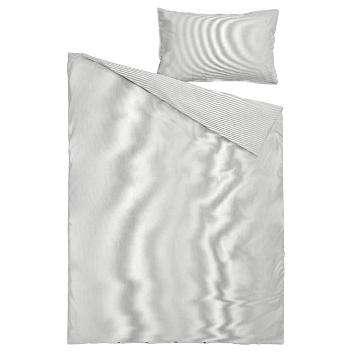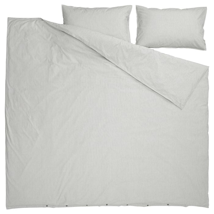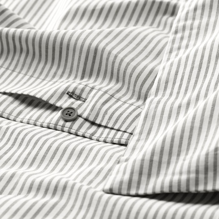 ست کاور لحاف و روبالشی ایکیا SOLFIBBLA با ترکیب رنگ طوسی و سفید و طرح راهراه انتخابی مدرن، خنثی و بسیار کاربردی برای اتاق خواب است. این رنگبندی بهراحتی با انواع دکوراسیون مینیمال، مدرن و حتی کلاسیک هماهنگ میشود و فضای خواب را مرتب و آرام نشان میدهد.